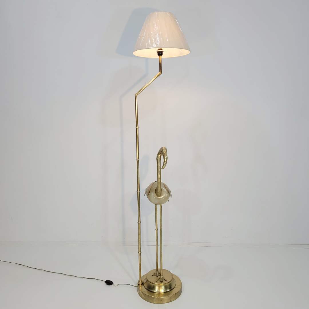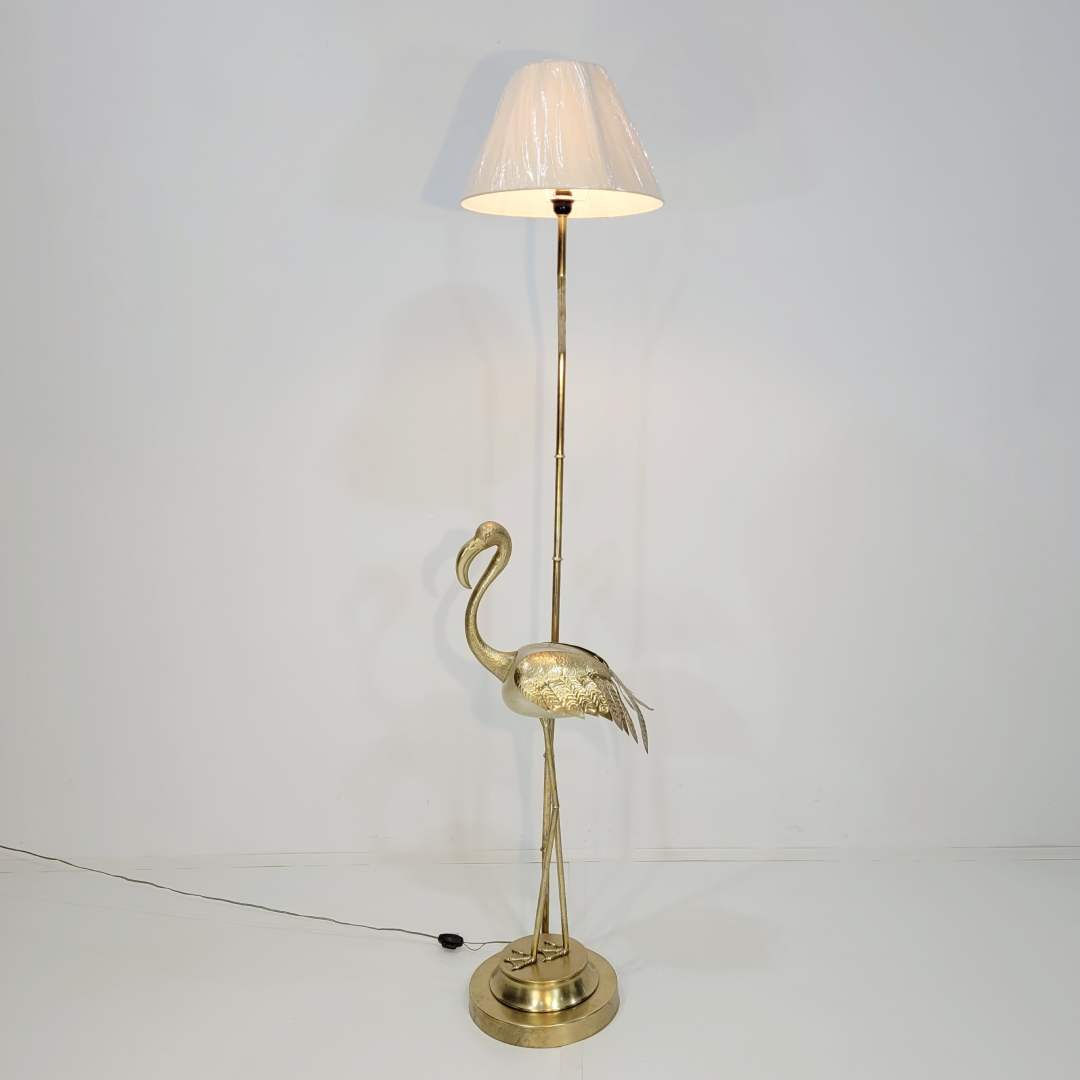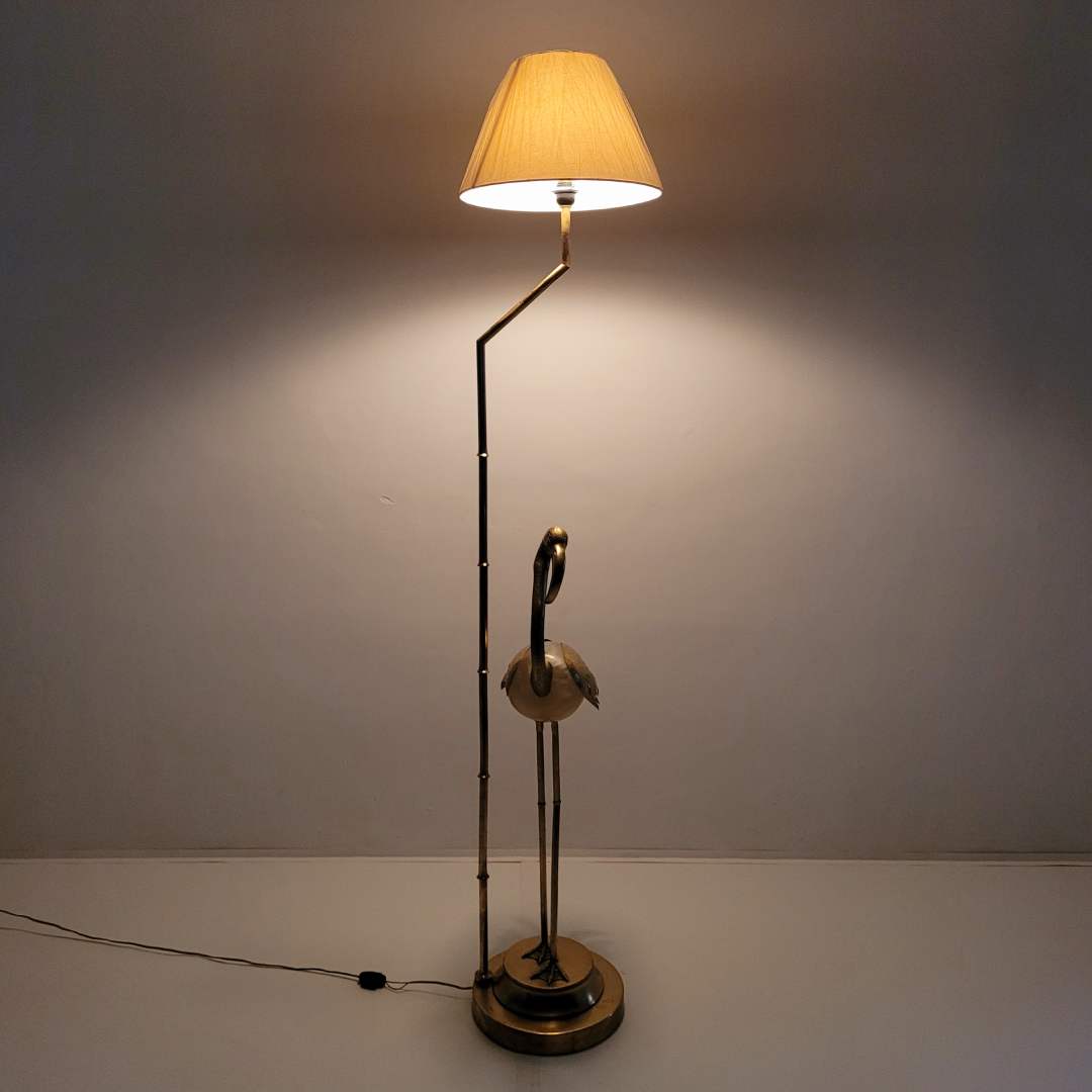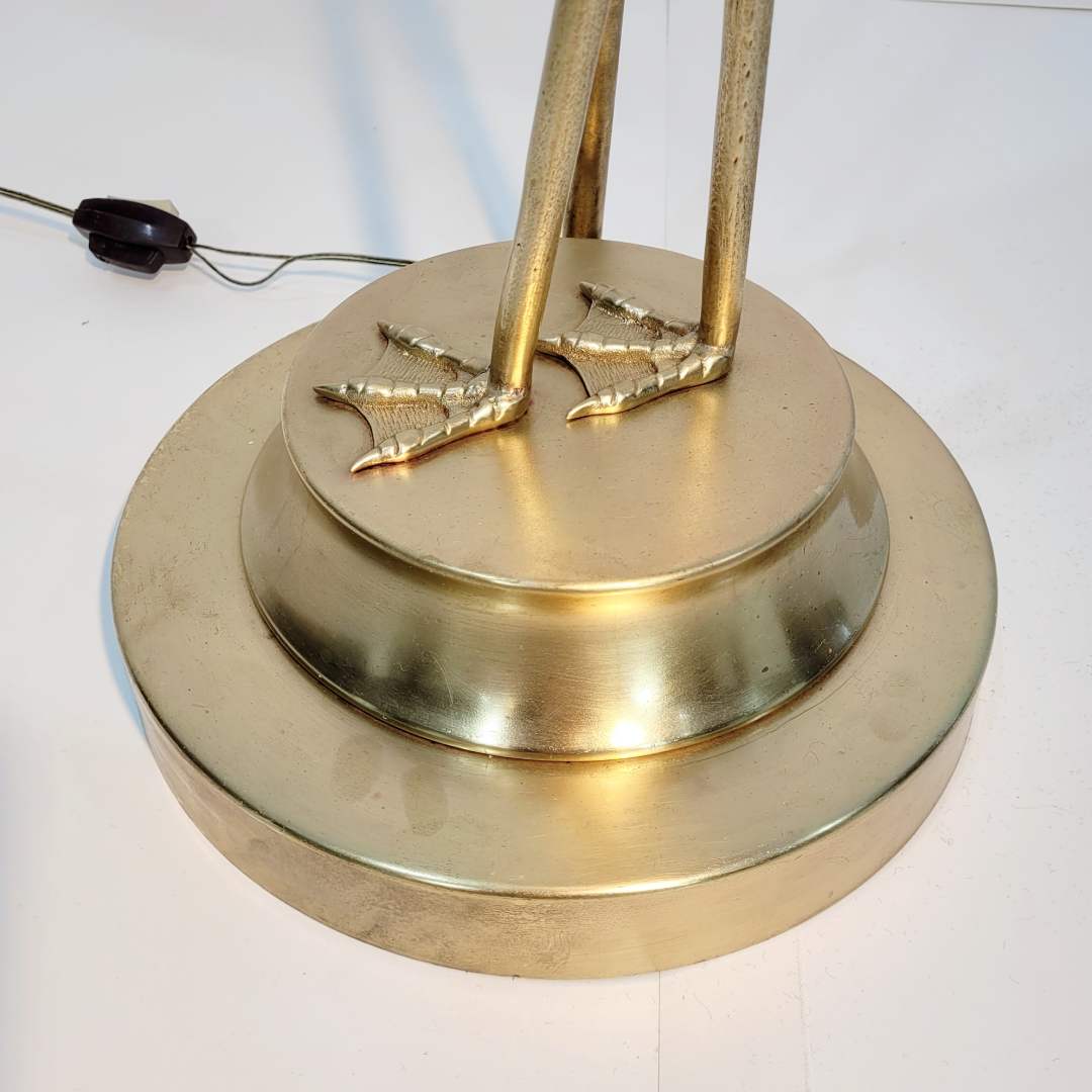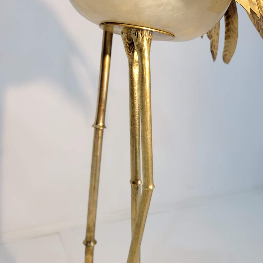 Luminária de pé com escultura de garça, executada em metal dourado.