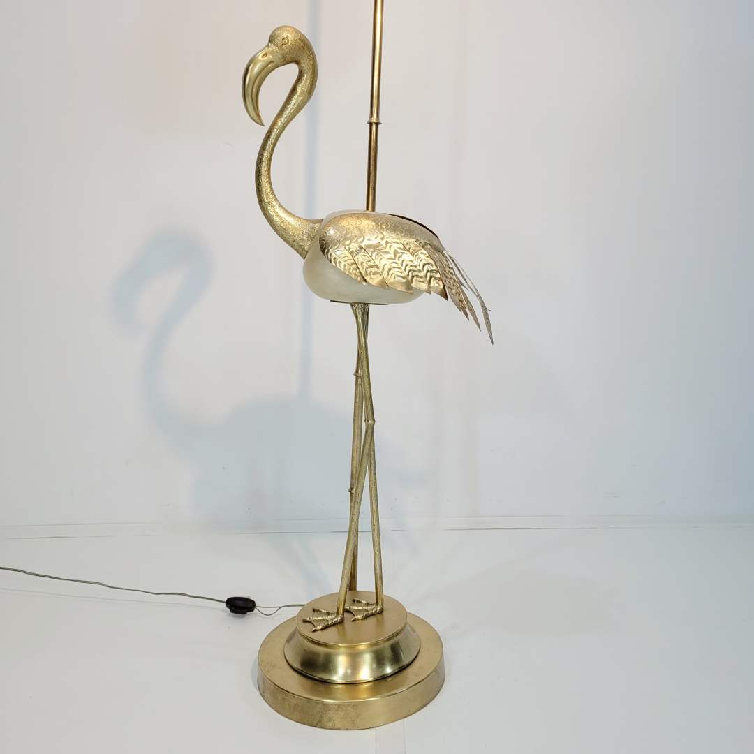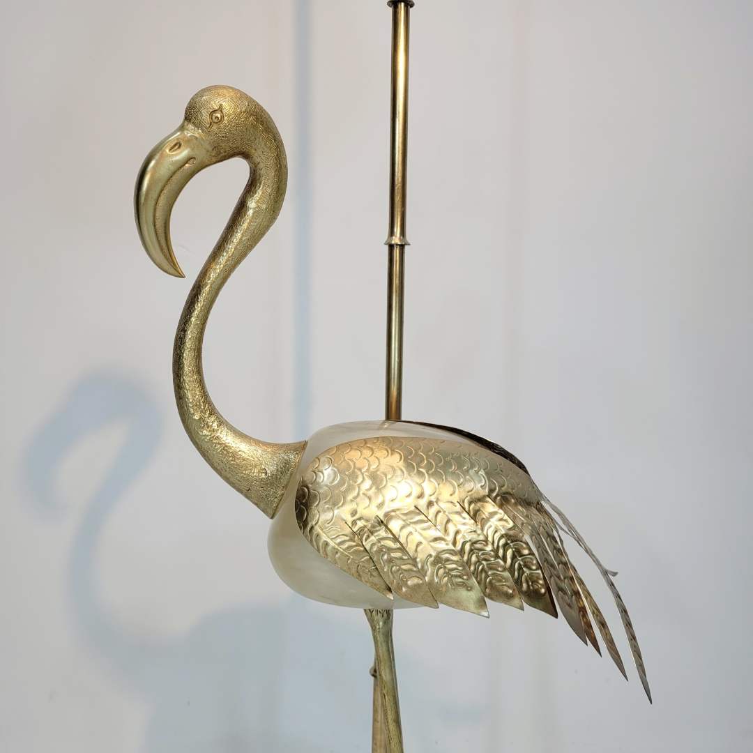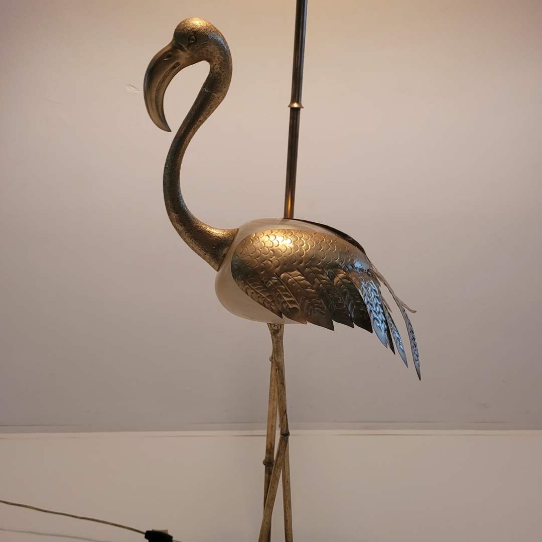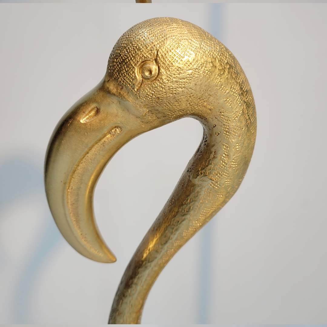 Luminária de pé com escultura de garça, executada em metal dourado.