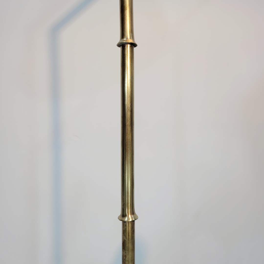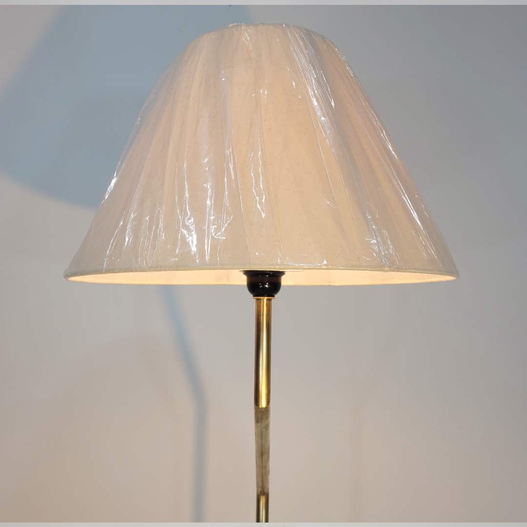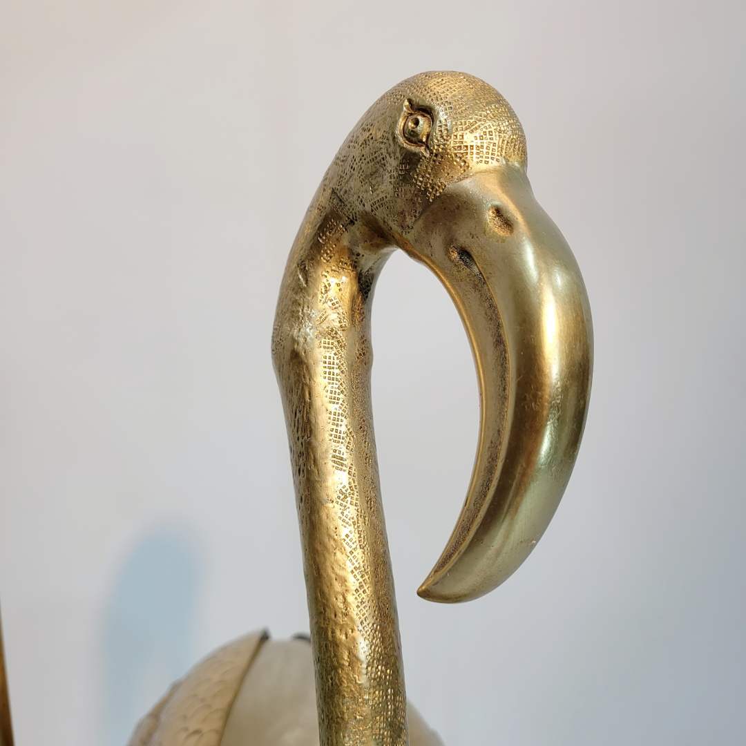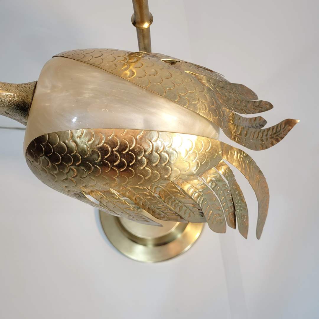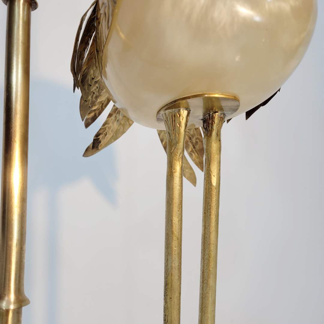 Luminária de pé com escultura de garça, executada em metal dourado.